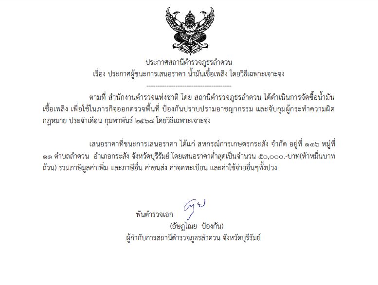 ประกาศการจัดซื้อจัดจ้าง(น้ำมันเชื้อเพลิง) ก.พ. 68 5 กุมภาพันธ์ 2568 โดย admin / ข่าวจัดซื้อจัดจ้าง PDFประกาศสถานีตำรวจภูธรลำดวน ก.พ.68ดาวน์โหลด Facebook iconFacebookTwitter iconTwitterLINE iconLine