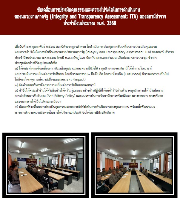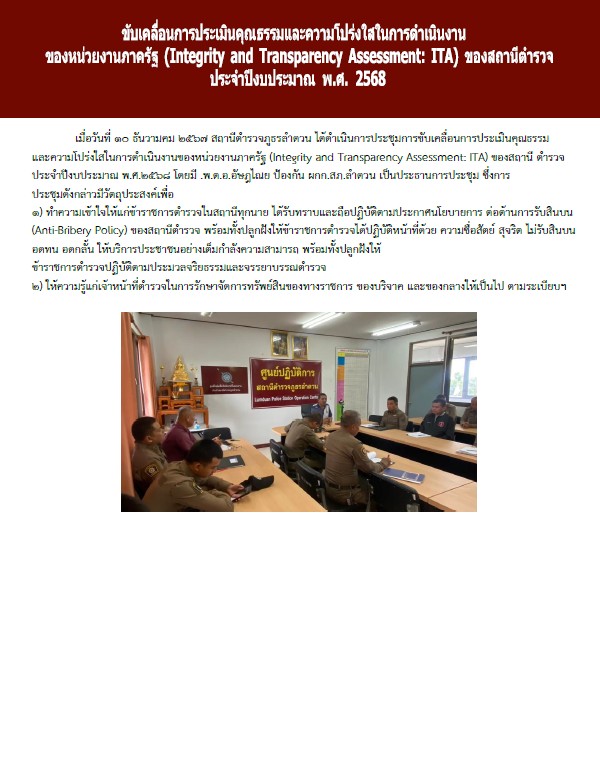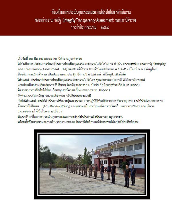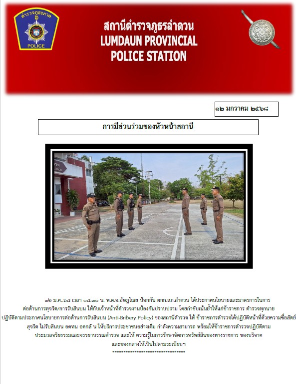 Home » มาตรฐาน ITA » การรายงานผลการดำเนินการเพื่อจัดการความเสี่ยงต่อการรับสินบน » O19 การมีส่วนร่วมของหัวหน้าสถานีตำรวจ